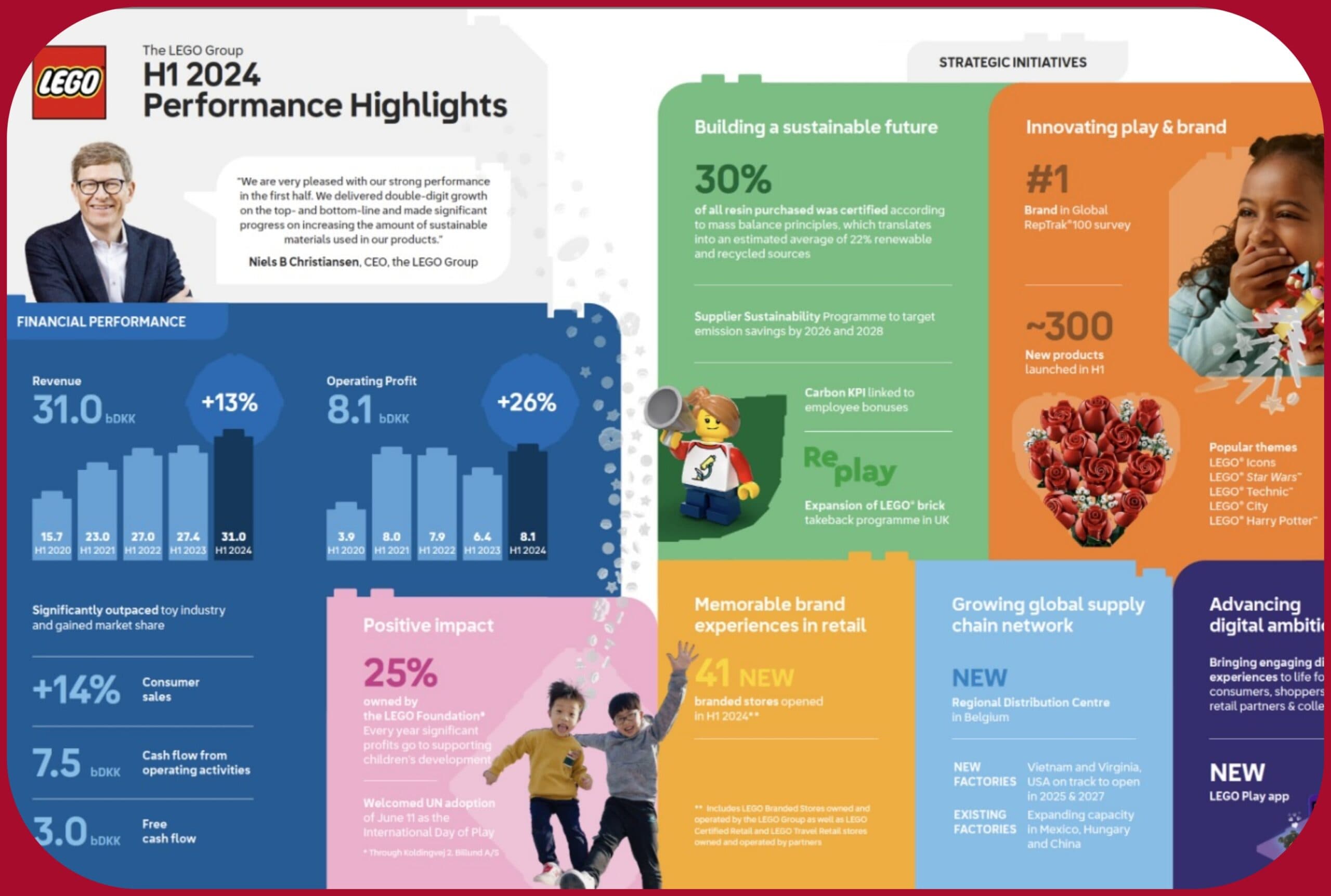 Wczoraj wieczorem Grupa LEGO udostępniła raport podsumowujący wyniki finansowe za pierwszą połowę 2024 roku. W porównaniu do raportu z 1 połowy 2023 r. możemy zauważyć kilka zmian: Przychody wzrosły o 13% do poziomu 31,0 miliardów DKK (ok. 17 860 450 428 zł) Sprzedaż konsumencka wzrosła ...