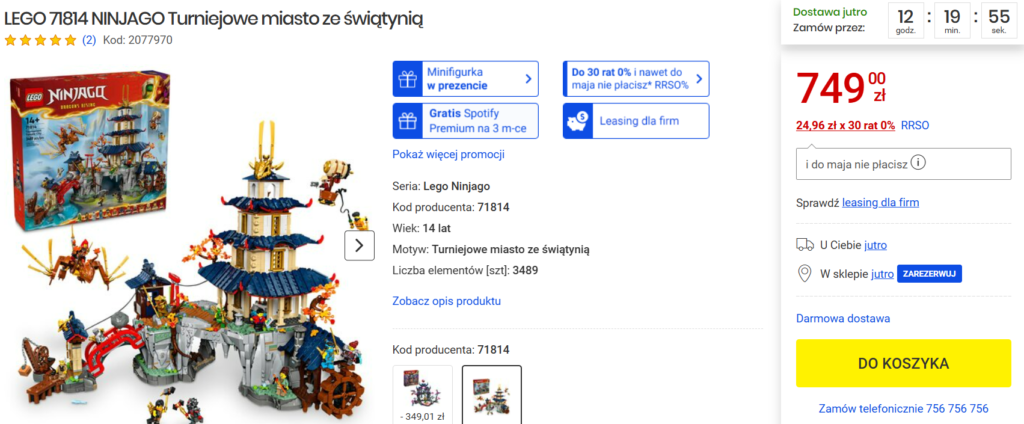 W sklepie Media Expert dorwiecie chwilowo zestaw 71814 Turniejowe miasto ze świątynią za 749 zł. Daje to nam rabat w wysokości 32% od ceny katalogowej!