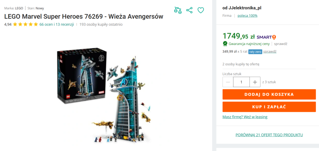 Na Allegro dorwiecie chwilowo zestaw 76269 Wieża Avengersów za 1749.95 zł. Daje to nam rabat w wysokości 19% od ceny katalogowej!