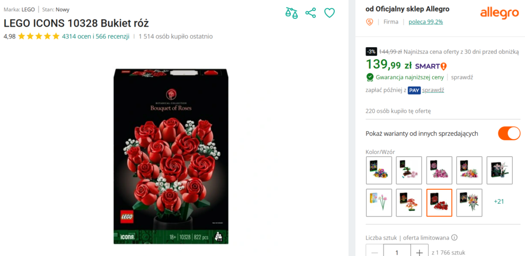 Na Allegro dorwiecie chwilowo zestaw 10328 Bukiet róż za 139.99 zł. Daje to nam rabat w wysokości 44% od ceny katalogowej!