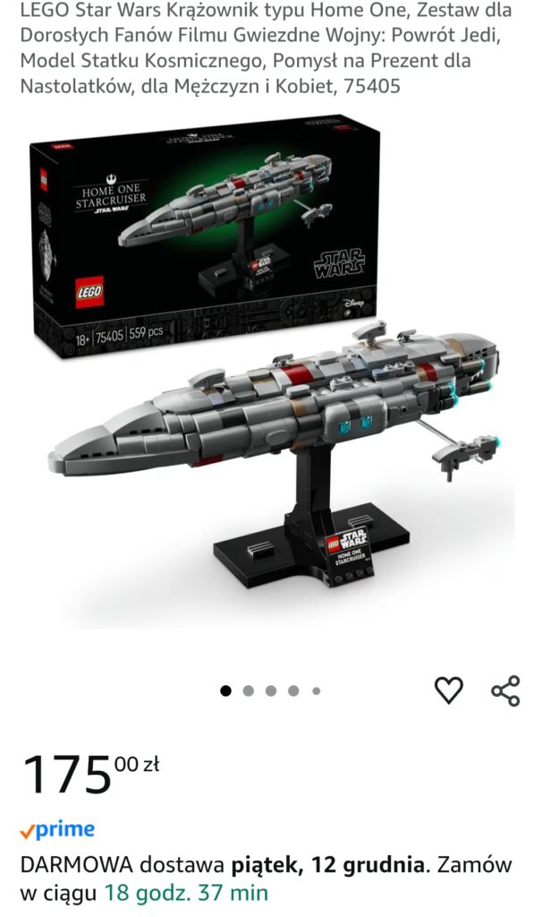 Na Amazonie dorwiecie chwilowo zestaw 75405 Krążownik typu Home One za 175 zł. Daje to nam rabat w wysokości 42% od ceny katalogowej!
