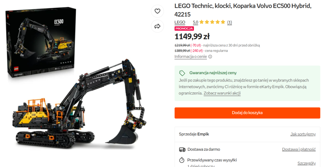 W sklepie Empik pojawiła się właśnie promocja na zestaw: 42215 Koparka Volvo EC500 Hybrid.