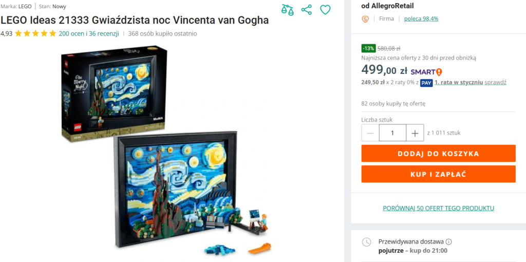 Na allegro pojawiła się właśnie promocja na zestaw: 21333 „Gwiaździsta noc” Vincenta van Gogha. Możecie go tam teraz zamówić z 33% rabatem. Czyli za 499 zł.