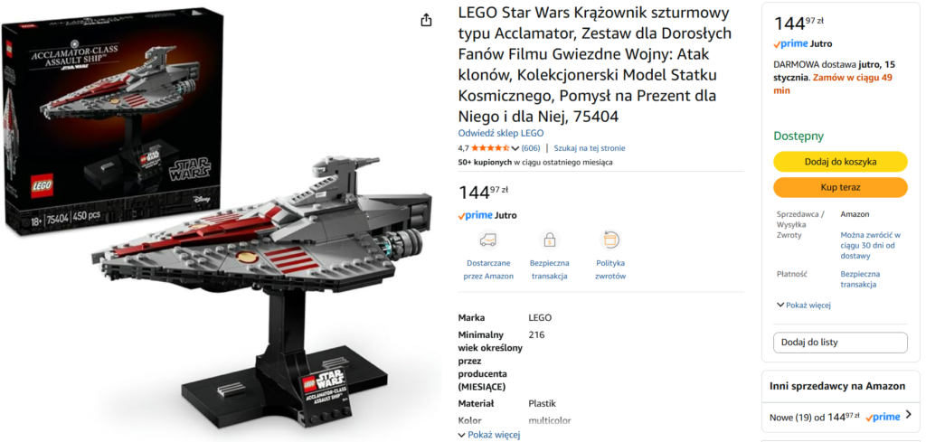 Na Amazonie pojawiła się właśnie promocja na zestaw: 75404 Krążownik szturmowy typu Acclamator.